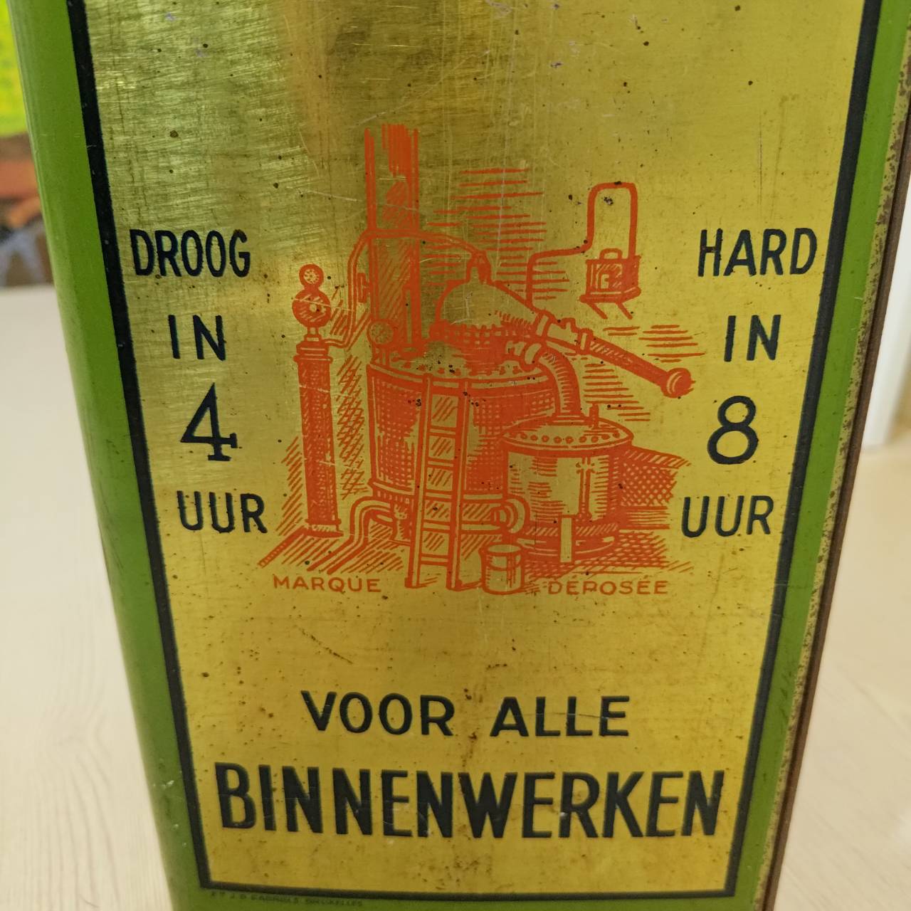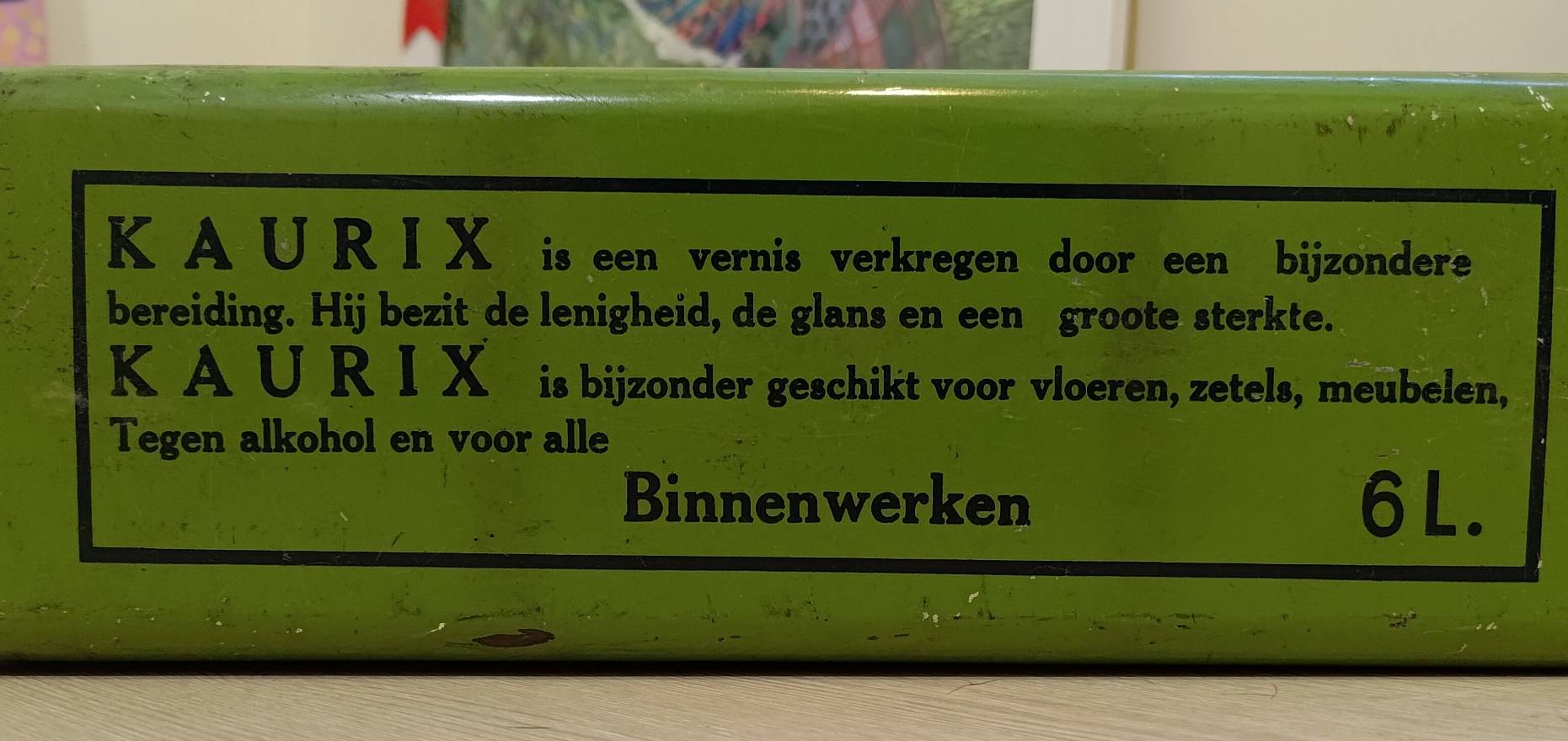 A highly decorative and collectible, incredibly rare in Taiwan, wood varnish container produced by a now defunct company in northern Belgium near the Dutch border – thus the language being in Dutch. Discovered at a vintage clothing shop in Shilin, Taipei.