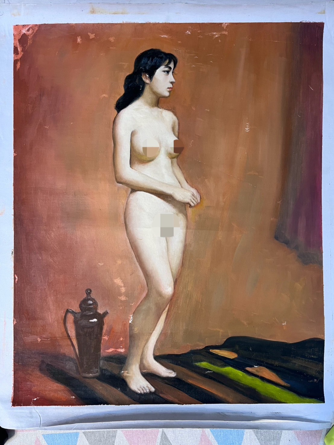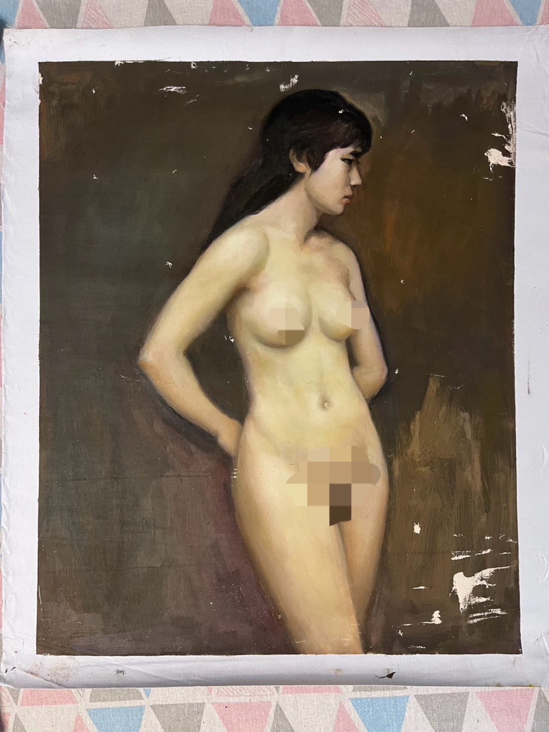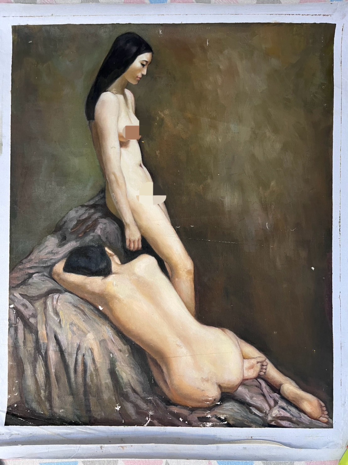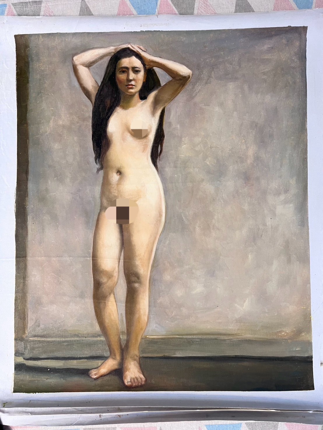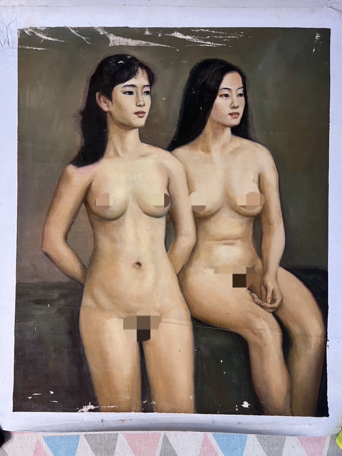 A series of six nudes – single figure and sometimes two together – painted on canvas. Still coloured magnificently and artistically naive but well painted, likely as part of a college course.