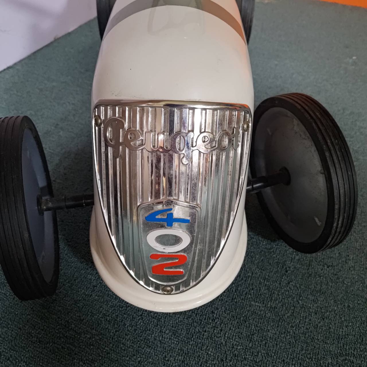 Off-white Baghera kid's Peugeot 402 Darl'Mat ride-on car recreating the art deco design of the original Peugeot 402 of the 1930s and early 1940s, which was known for its streamlined shape and hidden headlights.