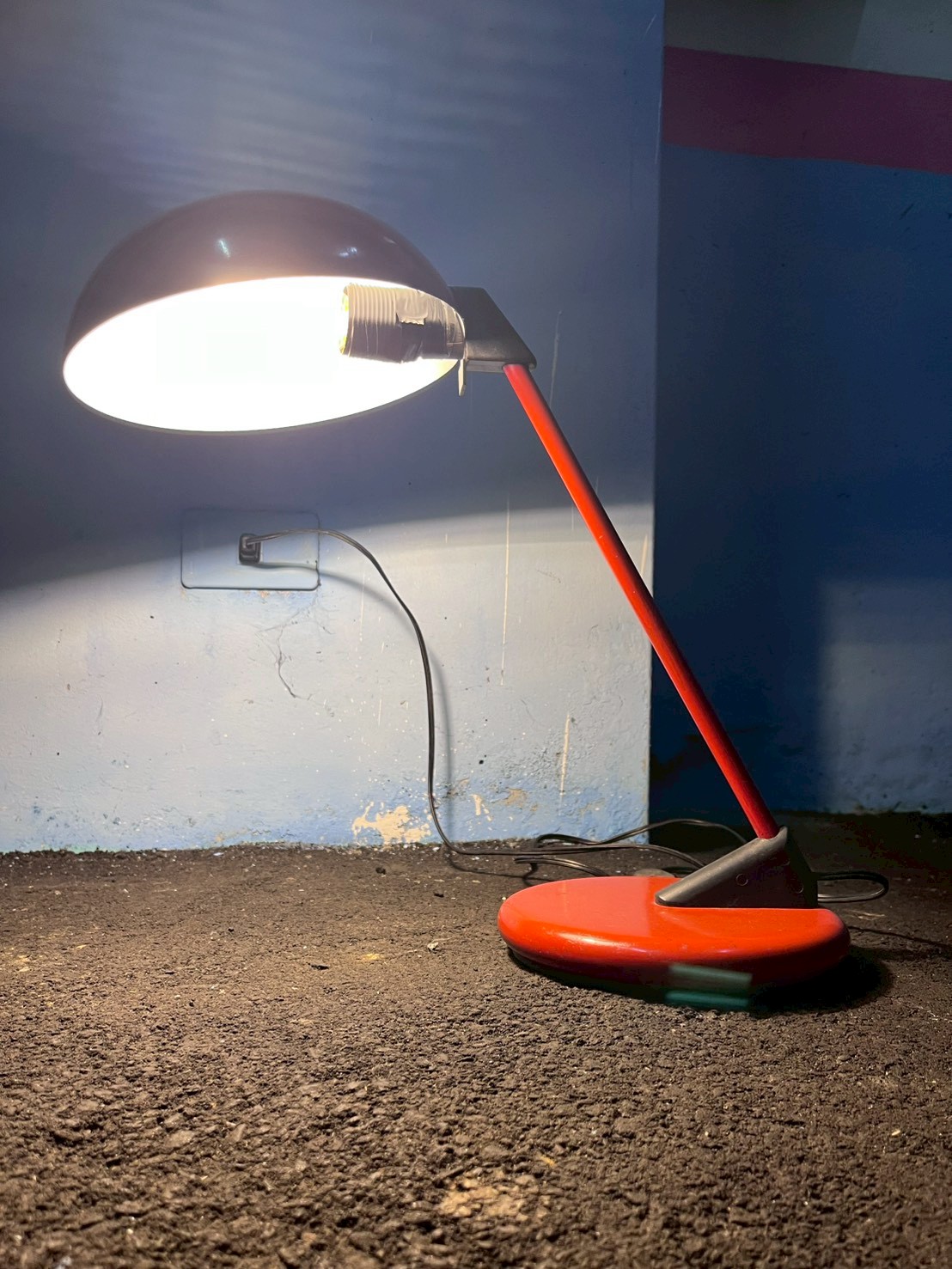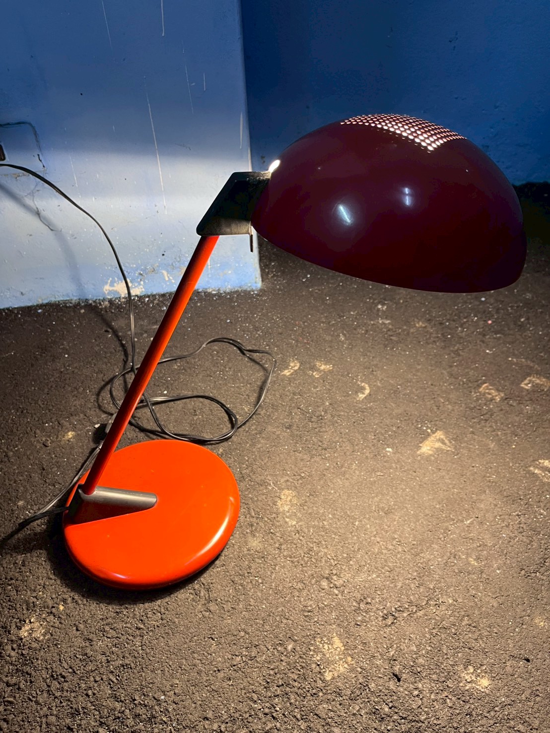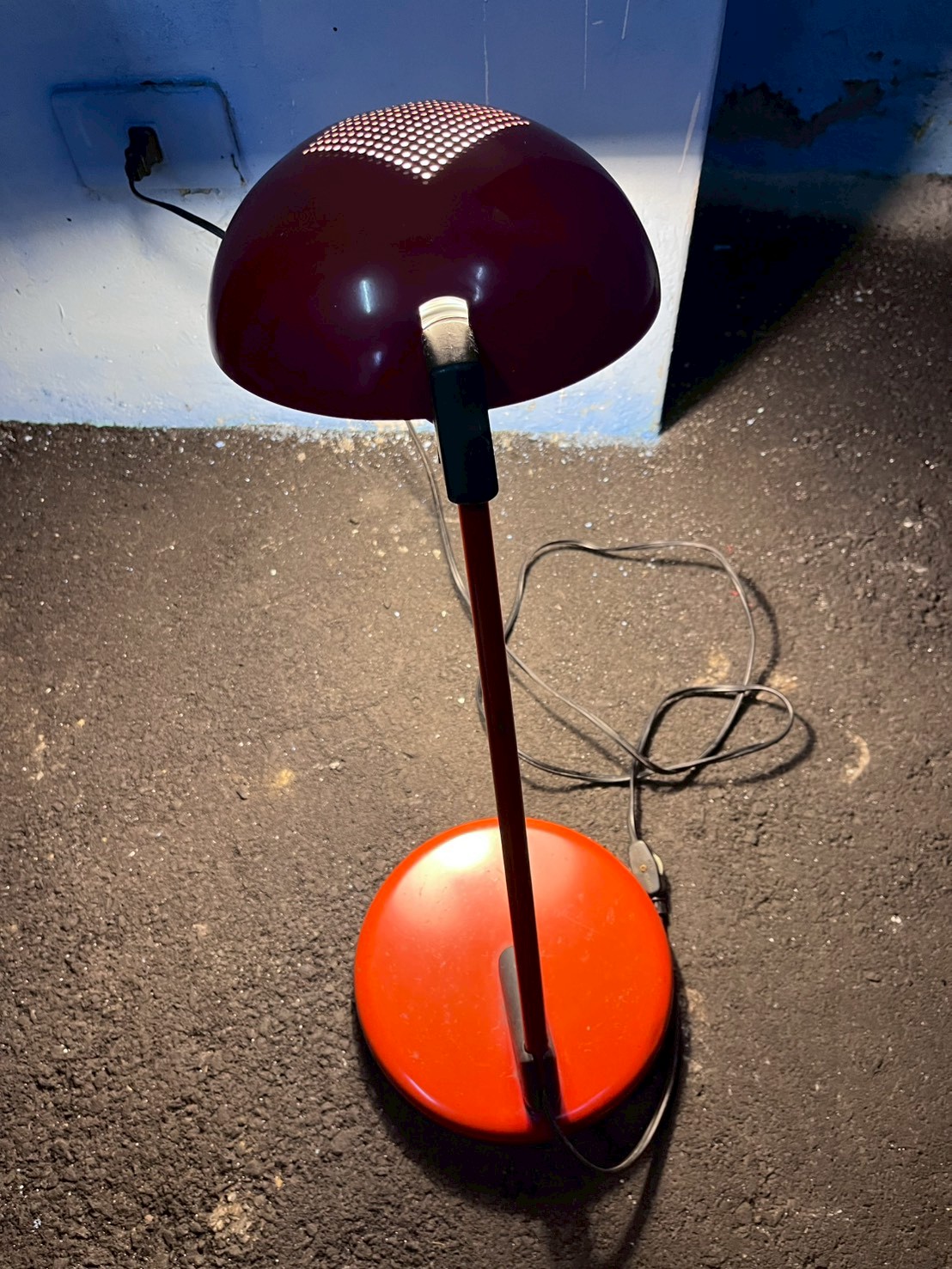 1960年代亮紅色西德桌燈,曾是保險公司辦公桌燈。此燈於台灣東部花蓮被發現。已重新配線,功能正常。