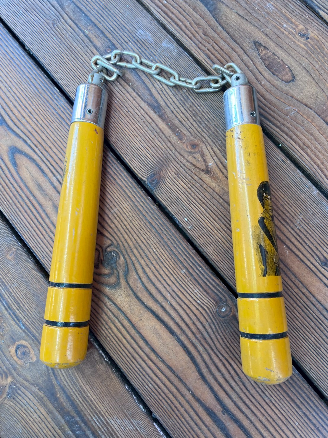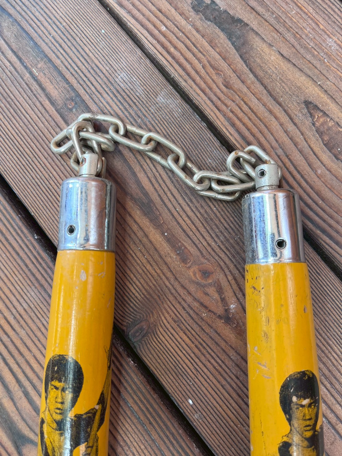 Yellow, short version (much rarer than longer versions) nunchaku decorated with image of the iconic martial artist Bruce on each piece – short version.